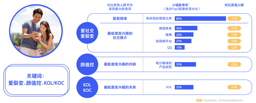 據(jù)騰訊、BCG《2020中國(guó)社交零售白皮書(shū)》調(diào)查數(shù)據(jù)表明,小鎮(zhèn)青年大多喜愛(ài)社交與裂變分享,特別是微信、微博、短視頻平臺(tái)和QQ;非常在意產(chǎn)品顏值,容易被酷炫的產(chǎn)品視覺(jué)激發(fā)興趣,希望買(mǎi)到好看的產(chǎn)品來(lái)彰顯個(gè)性,而不一定是好用的;同時(shí),極易被KOL在社交媒體上發(fā)布的信息所影響。