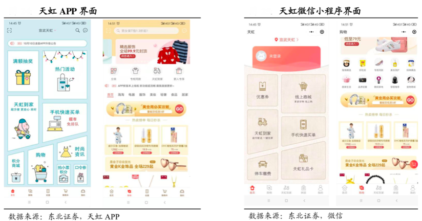經典案例:據東北證券、天虹APP、微信等綜合資訊顯示,天虹APP已經涵蓋其全業態,包括購物中心、便利店、超市、百貨同時數字化改造;已經囊括其全門店,所有功能從全國一線到四線城市200多家門店全部上線運營;已經覆蓋其“全流程”,集合了買單、客服、服務、評價等售前售中售后全服務價值鏈。