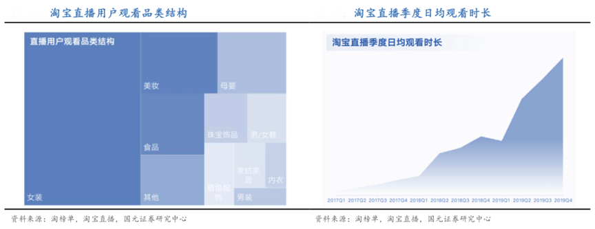 直播電商初步擺脫了“單一品類”的依賴,多品類直播、多場景直播等成為淘寶直播品牌策劃營銷的典型特色。根據淘榜單、淘寶直播和國元證券研究中心等綜合資訊表 明,2019年末淘寶直播每天可購買商品數量同比增長190%, 覆蓋淘寶天貓的絕大部分品類,其中女裝、美妝、母嬰、食品為最熱門的品類。直播內容場景日益豐富,截至2019年末,消費者每天可觀看的直播內容時長超 35 萬小時,直場景也由直播間擴展至工廠、田間、檔口、商場、街頭、市場等。
