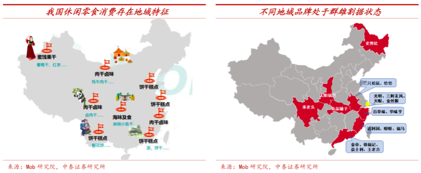 根據(jù)Mob研究院、中泰證券研究所等綜合資訊表明,我國休閑零食品消費(fèi)存在地域性特征,地域食品品牌尚處于“群雄割據(jù)”的狀態(tài),東部沿海地區(qū)以餅干糕點(diǎn)及肉類鹵味為主,西北地區(qū)以蜜餞果干類為主,長三角與珠三角是休閑食品品牌聚集地,而在其他地區(qū)亦分布有當(dāng)?shù)仄放疲虼司€下市格局較為散亂,行業(yè)正處于區(qū)域龍頭品牌群雄割據(jù)、行業(yè)領(lǐng)先品牌走向全國的分化成長階段。