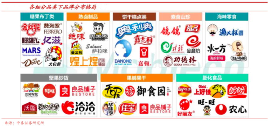 “全品類擴(kuò)張”是休閑食品企業(yè)發(fā)展的“關(guān)鍵性成長路徑”,亮化多元化食品品類,刷新復(fù)合式休閑食品組合,點(diǎn)亮休閑食品消費(fèi)價值,做“細(xì)分領(lǐng)域第一品牌”更具“產(chǎn)業(yè)戰(zhàn)略價值”。根據(jù)中泰證券研究所等綜合資訊表明,休閑食品各細(xì)分品類下品牌分布格局相對松散,三只松鼠、良品鋪?zhàn)印俨菸兜三堫^近年來正在積極進(jìn)行全品類擴(kuò)張,而大多細(xì)分品牌則仍處于聚焦主營產(chǎn)品的大單品模式發(fā)展階段,整體而言各細(xì)分品類下的品牌分布格局仍較為分散。
