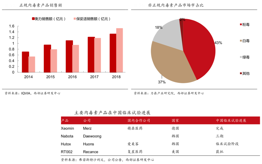 經典案例:根據IQVIA、力鼎產業研究院、公司官網、弗若斯特沙利文、公司公告、西部證券研發中心等綜合資訊表明,行業龍頭愛美客等也在積極布局肉毒素市場。愛美客于 2018 年 9 月與韓國 Huons Co., Ltd.公司簽訂 A 型肉毒毒素產品在中國的合作協議,Huons 授權愛美客在中國區域內進口、注冊和經銷其生產的 A 型肉毒毒素產品,愛美客負責完成該產品在中國的臨床試驗 及注冊申請。