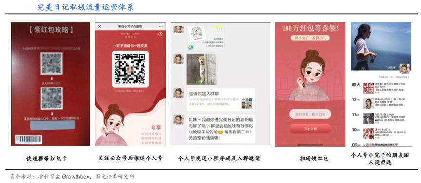 經典案例:根據增長黑盒Growthbox、國元證券研究所等綜合資訊表明,以彩妝品牌完美日記為例,品牌通過產品附帶的二維碼作為流量入口,利用微信群 與個人客服號構建私域流量運營體系,實現了深度消費者溝通。消費者在完美日記首次完成購買后會收到附帶的紅包卡,引導客戶關注完美日記公眾號和個人客服“小完子”,其個人號“小完子”是有獨立人設的美妝顧問,她的朋友圈會發 美妝教程、素顏自拍、產品圖片,同時為客戶解答疑問,分享優惠。