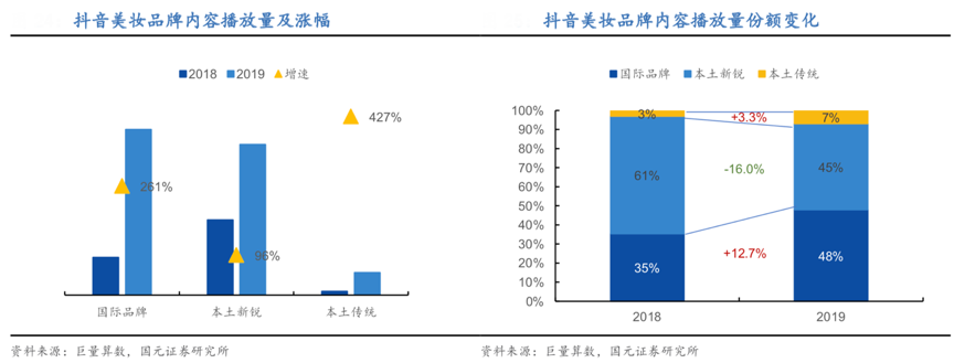 經典案例:根據巨量算數、國元證券研究所等綜合資訊表明,2018年以來,以抖音、快手為代表的短視頻平臺開始加速商業化,成為新興紅利營銷媒介,2020 年抖音、快手的 DAU 分別突破 6 億 與 3 億,成為最普及的內容平臺之一,各大美妝品牌紛紛入局,加大在核心短視頻平臺的投放。2019 年,抖音美妝品牌年度關注量較 2018 年增長了 166%,其中國際品 牌與本土傳統品牌增長更明顯,內容播放量同比增速分別達到 261%與 427%。
