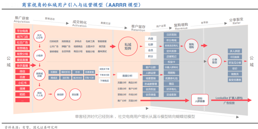 經典案例:根據有贊、國元證券研究所等綜合資訊表明,單客經濟時代已經到來,社交電商用戶增長從漏斗模型轉向“蝴蝶結模型”。在公域流量成本攀升、私域人群需求多樣化、 數據資產在品牌打造全流程重要度提升的大背景下,私域流量的匯集與運營價值凸顯,品牌方多通過線上+線下引流的方式,將消費者導入基于微信平臺的會員系統/微信群中,并通過發放優惠券、線上客服等方式進行反復觸達。
