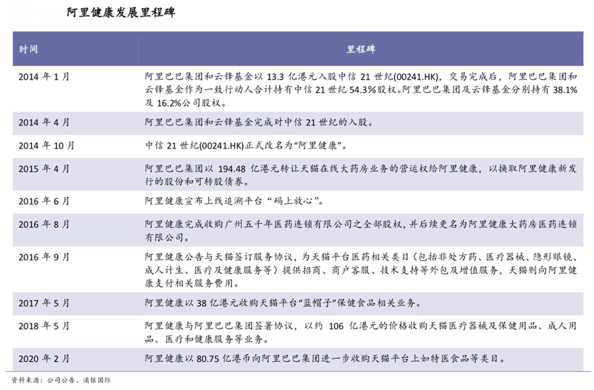 經典案例:根據公司公告、浦銀國際等綜合資訊表明,阿里健康是阿里巴巴集團在大健康領域的旗艦平臺,主要業務包括醫 藥自營業務、醫藥電商平臺業務、消費醫療業務等。截至 2020 年 3 月,阿里健康線上自營店年度活躍消費者數量超過 4800 萬。