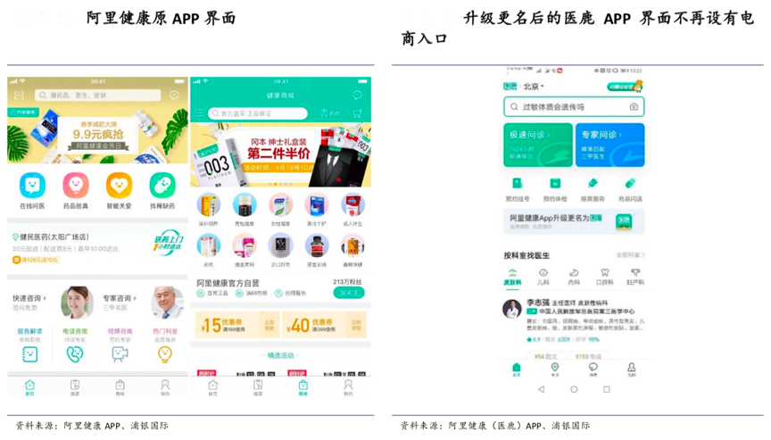 經典案例:根據阿里健康APP、浦銀國際等綜合資訊表明,隨著網售處方藥的政策限制放開,阿里健康自營平臺在和天貓聯合推出“放心購藥”的基礎上,自營業務推出“慢病福利計劃”,為慢病人群提供專屬“云醫生”、原廠直供藥品、個性化用藥指導等一系列慢病管理服務。2020年 9 月 3 日,阿里健康 APP 更名為“醫鹿”,阿里健康準備在 “醫療”上傾斜更多的資源投入,獨立于醫藥電商,打造更專業的線上問診平臺。
