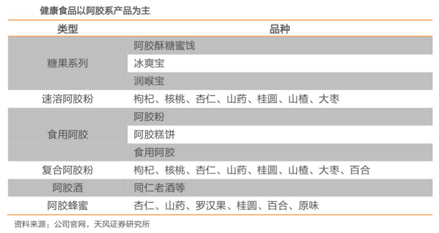 經(jīng)典案例:根據(jù)公司官網(wǎng)、天風(fēng)證券研究所等綜合資訊表明,同仁堂公司健康食品的開發(fā)以阿膠系產(chǎn)品為主,主張“藥食同源”理念,包括了糖果系列、速溶阿膠粉、食用阿膠、阿膠酒、復(fù)合阿膠粉和阿膠蜂蜜等多種健康食品。