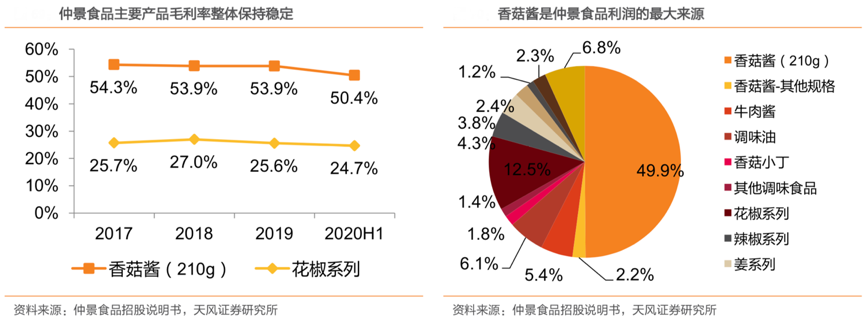 經典案例:根據仲景食品招股說明書、天風證券研究所等綜合資訊表明,從毛利角度看,2020H1調味食品對主營業務毛利貢獻率為 66.80%,其中香菇醬(210g) 是公司主營業務利潤的最大來源,毛利貢獻率達到 49.87%,香菇醬的毛利率趨勢對公司整體有較大影響力。