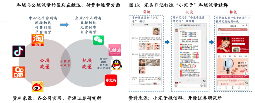經典案例:根據各公司官網、小完子微信群、開源證券研究所等綜合資訊表明,思維方面,零售商家由依賴平臺、被動購買流量的思維升級為主動吸引用戶,提升轉化和留存的用戶思維。以完美日記為例,公司憑借高效的“小完子”微信私域營銷體系,2019和2020年連續登頂天貓雙十一彩妝榜單榜首,母公司逸仙 電商于2020年11月19日在紐交所上市。