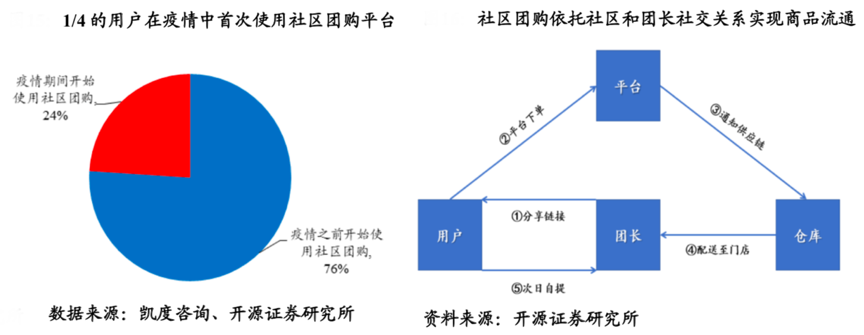 經典案例:根據凱度咨詢、開源證券研究所等綜合資訊表明,根據凱度數據統計,有1/4的用戶在疫情中首次使用社區團購平臺。隨著互聯網巨頭相繼加碼入局,社區團購行業也迎來加速發展,生鮮成為線下超市經營關鍵品類,到家需求快速增長。