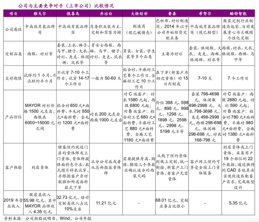 經(jīng)典案例:根據(jù)公司招股說明書、wind、公司年報(bào)、光大證券研究等綜合資訊表明,一些成衣品牌順應(yīng)市場需求將業(yè)務(wù)延伸到定制服裝產(chǎn)品,推出了定制系列或定制子品牌(如報(bào)喜鳥、雅戈?duì)柕?,同時(shí)行業(yè)內(nèi)已著手進(jìn)行服裝大規(guī)模個(gè)性化定制業(yè)務(wù),并取得了一定成績的上市公司(或曾經(jīng)上市)主要有雅戈?duì)?、?bào)喜鳥、喬治白、大楊創(chuàng)世、魯泰紡織以及希努爾等。