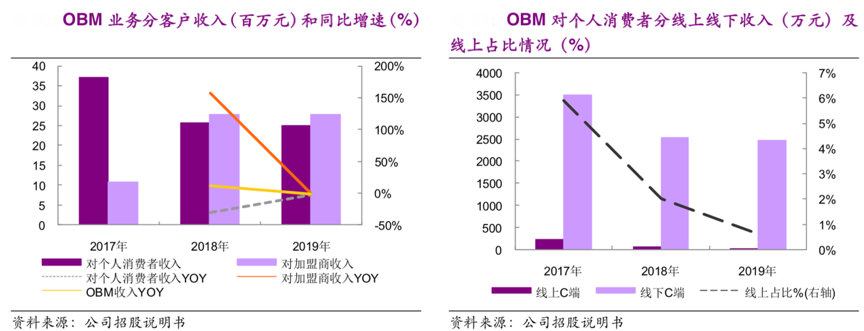 典型現(xiàn)象:根據(jù)公司招股說明書、光大證券研究等綜合資訊表明,酷特智能公司 OBM 業(yè)務(wù)可按客戶分為個(gè)人消費(fèi)者和加盟商,2019年 OBM 模式下對個(gè)人消費(fèi)者和對加盟商的收入分別為 2495 萬元、2794萬元,規(guī)?;鞠喈?dāng)、分別占 OBM 業(yè)務(wù)收入比例為 47%、53%。近三年來公司直營 比例下降(對個(gè)人消費(fèi)者收入持續(xù)下滑),加盟占比則持續(xù)提升,2017~2019 年末公司直營店分別為 16 家、8 家、5 家呈逐步 收縮態(tài)勢,2019 年末的 5 家直營店分布于北京、青島(3 家)、即墨。收入分渠道來看,對個(gè)人消費(fèi)者收入絕大多數(shù)為線下,線上占比較低、2019 年占對個(gè)人消費(fèi)者收入不到 1%。
