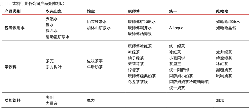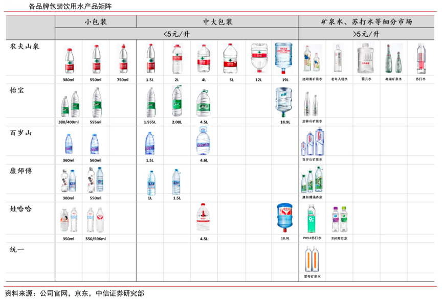 經典案例:根據公司官網、京東及中信證券研究部等綜合資訊表明,農夫山泉在包裝飲用水布局上兼具廣度和深度,一方面在包裝規模的設計上SKU最寬、最密,覆蓋各個消費場景;另一方面推出差異化產品(嬰兒水和鋰水)和高端化產品(天然礦泉水的運動蓋裝和玻璃瓶)。同時在飲料布局上,其積極布局成長較快的細分賽道并持續深耕選中的品類,享受行業發展紅利。