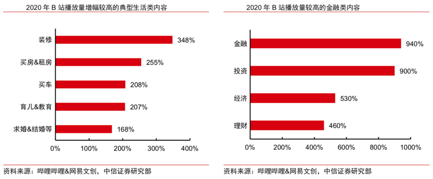 經(jīng)典案例:根據(jù)嗶哩嗶哩&網(wǎng)易文創(chuàng)、中信證券研究部等綜合資訊表明,2020 年 B 站中關(guān)于房屋裝修、結(jié)婚、買(mǎi)車(chē)等生活類(lèi) PUGV內(nèi)容播放量大幅提升,裝修、買(mǎi)房&租房、買(mǎi)車(chē)的內(nèi)容播放量分別增長(zhǎng)348%、255%、208%。同時(shí)關(guān)于金 融、投資、理財(cái)?shù)葍?nèi)容的視頻播放量分別增長(zhǎng) 940%、900%、460%。以購(gòu)車(chē)、金融等相關(guān)的垂類(lèi)內(nèi)容的崛起為 B 站與相關(guān)行業(yè)的廣告商進(jìn)一步合作奠定了堅(jiān)實(shí)的基礎(chǔ)。
