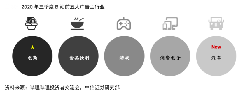 經(jīng)典案例:根據(jù)嗶哩嗶哩投資者交流會(huì)、中信證券研究部等綜合資訊表明,隨著 Z 世代用戶從學(xué)校步入職場(chǎng),其消費(fèi)能力和興趣的變化吸引了更多廣告商入駐嗶 哩嗶哩。根據(jù)嗶哩嗶哩2020Q3 的財(cái)報(bào)發(fā)布會(huì),2020Q3 其廣告投放行業(yè)前五分別是電商、食品飲料、游戲、3C 電子和汽車(chē),汽車(chē)行業(yè)在該季度首次躋身廣告主前五名。