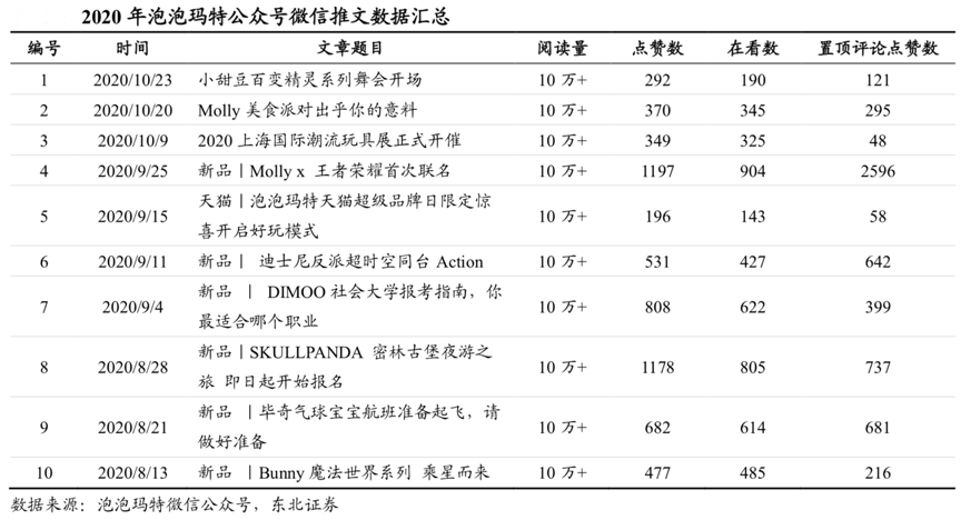 經典案例:根據泡泡瑪特微信公眾號、東北證券等綜合資訊表明,泡泡瑪特在積極運營微信公眾號、微博、抖音等新媒體渠道。其中,抖音粉絲 105 萬+,微博粉絲 66 萬+,小紅書粉絲14 萬+(截至 2020 年 10 月 27 日),尤其是微信公眾號,截至 2020H1,公司官方微信公眾號擁有 240 萬粉絲,文章瀏覽量頻頻 10 萬+,點贊數和在看數處于較高水平。