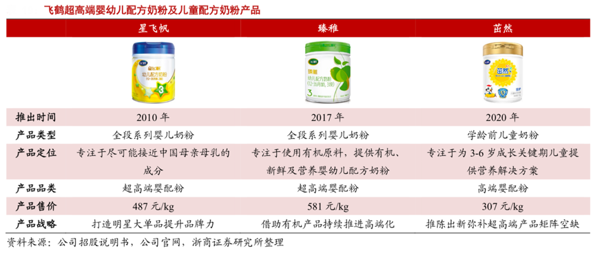 經典案例:根據公司招股說明書、公司官網、浙商證券研究所等綜合資訊表明,2017 年 4 月飛鶴推出“臻稚系列奶粉”,定位“提供有機、新鮮及營養嬰幼兒配方奶粉”,2020 年 7 月,飛鶴推出高端系列產品“茁然”,定位 3-6 歲 成長發育黃金期的兒童,彌補公司在高端學齡前兒童奶粉市場的空缺,與星飛帆、臻稚形成的產品矩陣涵蓋全年齡段 高端嬰幼兒奶粉需求,為公司攻占一二線市場提供又一利器。