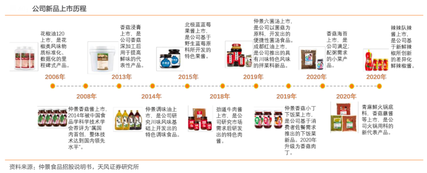 經(jīng)典案例:根據(jù)仲景食品招股說明書、天風(fēng)證券研究所等綜合資訊表明,自成立以來,仲景食品就不斷推陳出新,幾乎每年都會推出不同品類或風(fēng)味的新品,緊隨市場潮流,滿足不同客戶的需求。2006 年,花椒油 120 上市;2008 年,仲景香菇醬上市。2018-2019 年,其陸續(xù)推出牛肉醬、香菇小丁、藍(lán)莓醬、成都紅油等調(diào)味食品,市場反響良好,形成了新的利潤增長點(diǎn)。