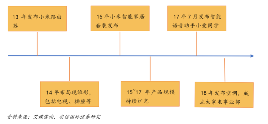 經典案例:根據艾媒咨詢、安信國際證券研究等綜合資訊表明,小米的智能家居生態鏈布局,可以追溯到 2013 年,在 2013 年 11 月小米發布了小米路由器。打算以路由器為中心,將智能家居硬件聯網并以手機 APP 為入口控制所有硬件。隨后,小米變便開始了整體的布局,并且日益繁盛。