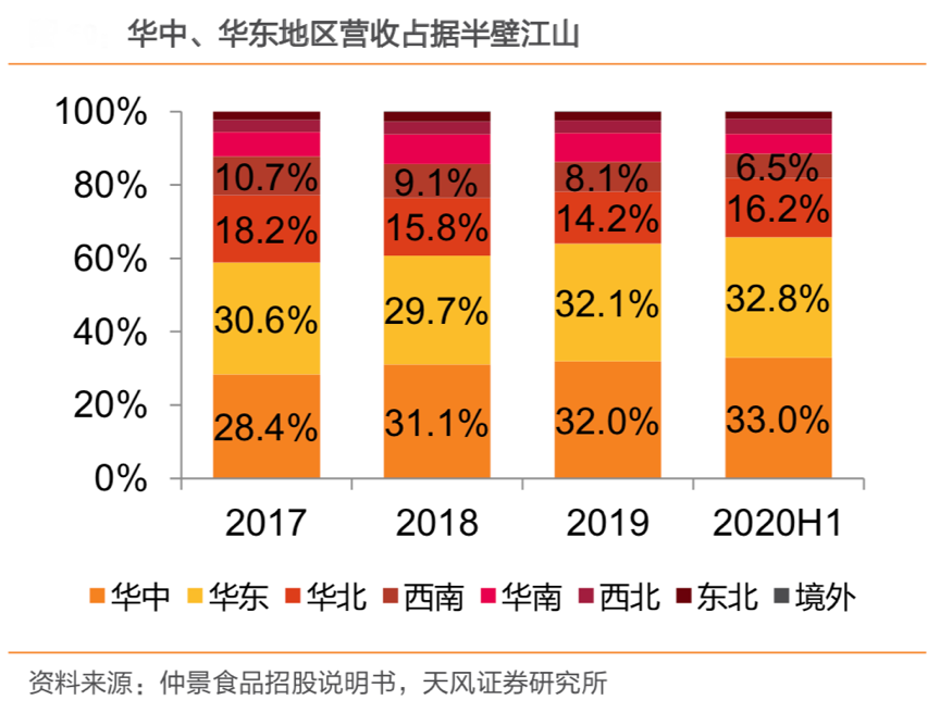 經典案例:根據仲景食品招股說明書、天風證券研究所等綜合資訊表明,仲景食品深入挖掘華中地區、華東地區食品制造業較為發達的區位優勢,推動花椒系列、辣椒系列等調味配料進入各食品制造企業的采購目錄;同時,不斷創新牛肉醬等新品類,河南省和山東省調味食品銷售收入占 公司調味食品銷售收入的比例接近60%,2020H1 占比達 58.80%。