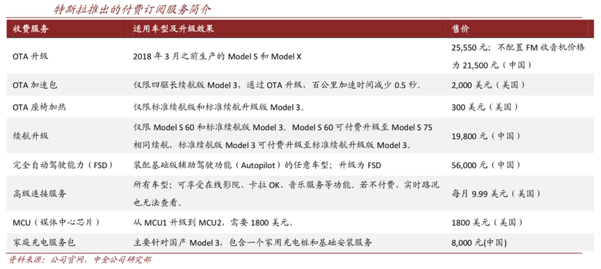 經典案例:根據公司官網、中金公司研究部等綜合資訊表明,特斯拉 2019 年銷量約為 33 萬輛,截至 2019 年全球保有量約 77 萬輛,隨著產銷量不斷爬坡,保有量持續上漲, 特斯拉推出了一系列付費升級及付費訂閱服務,收入來源從主要由“新車貢獻”逐漸轉向“增量+保有量”共同貢獻。