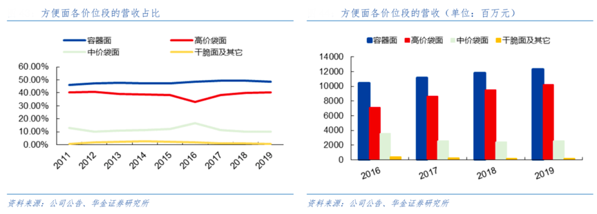 經(jīng)典案例:根據(jù)公司公告、華金證券研究所等綜合資訊表明,截至2019年康師傅方便面銷售量市占率 43.3%,維持第一的市占率水平。從銷售額方面,公司的方便面銷售達(dá)到 253 億元,在方便面市場(chǎng)的規(guī)模遙遙領(lǐng)先。其中,高端方便面的營(yíng)收是逐年上升的,其中 2019 年容器面和高價(jià)袋面分別實(shí)現(xiàn)營(yíng)收 123 億元和 102 億元,收入占比提升到 89%;中價(jià)及中低價(jià)方便面的收入占比下降到 11%左右。