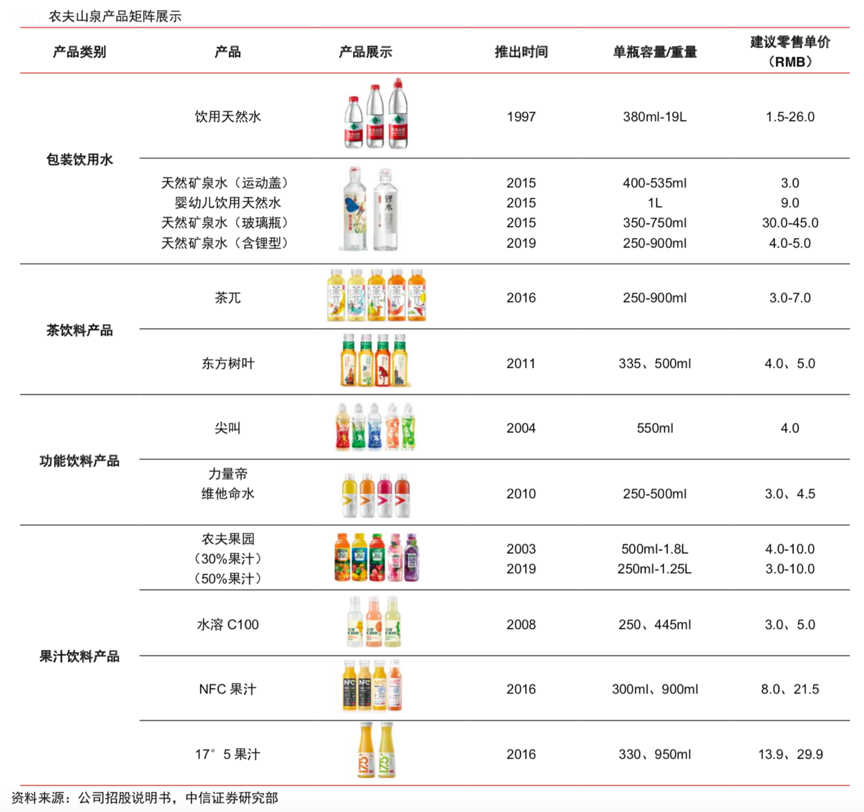 經(jīng)典案例:根據(jù)公司招股說(shuō)明書、中信證券研究部等綜合資訊表明,農(nóng)夫山泉秉承“天然、健康”的品牌理念,以包裝飲用水為基本盤,布局果汁飲料、茶飲料等 多個(gè)飲料賽道,已經(jīng)發(fā)展成為中國(guó)包裝飲用水及飲料行業(yè)的龍頭企業(yè)。根據(jù)弗若斯特沙利 文(轉(zhuǎn)引自農(nóng)夫山泉招股書)數(shù)據(jù),2012-2019 年,公司包裝飲用水連續(xù)八年市占率排名第一,茶飲料、功能飲料、果汁飲料市場(chǎng)份額均位于行業(yè)前三名。