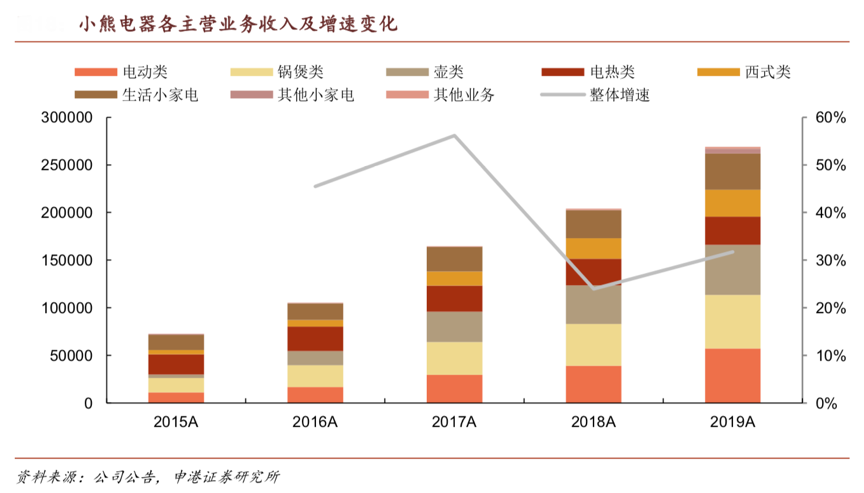 經(jīng)典案例:根據(jù)公司公告、申港證券研究所等綜合資訊表明,小熊電器以廚房小家電為核心,下分電動類、鍋煲類、壺類、電熱類、西式類等五項,結(jié)合生活小家電共六大類業(yè)務(wù),同時其他小家電開拓嘗試,廣泛開拓、充分覆蓋小家電長尾市場。這一多元戰(zhàn)略下在長尾市場形成合力,2019年其實現(xiàn)營收 26.9 億元,2015-2019年4年CAGR高達38.8%。