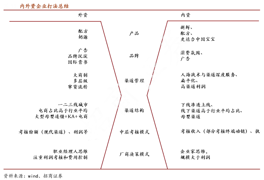 經(jīng)典案例:根據(jù)wind、招商證券等綜合資訊表明,外資優(yōu)勢(shì)在于——“品牌”,品牌的基礎(chǔ)是依托海外奶源的信任感、以及進(jìn)入中國(guó)以來(lái)廣宣帶來(lái)的知名度,問(wèn)題在于渠道 無(wú)法下沉、也并不能完全適應(yīng)(中小型)母嬰店打法。內(nèi)資大部分品牌,優(yōu)勢(shì)在于能在 下線城市組織渠道服務(wù),但是問(wèn)題在于安全性上不受充分信任,品牌力無(wú)法提升,因此在較為透明的現(xiàn)代渠道和大型連鎖,很難有 PK 外資的話語(yǔ)權(quán)。