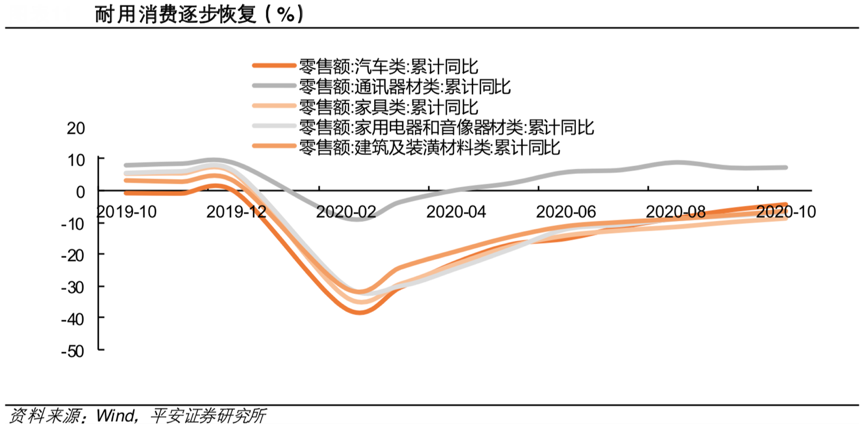典型數據:根據wind、平安證券研究所等綜合資訊表明,耐用消費指家電家具等房地產相關消費、汽車、通訊類消費,對部分有使用需求的消費者而言,這類消費仍具備必需屬性,消費一般只會延后而不會消失。在疫情巔峰期后,延后消費需求開始涌現,相關需求開始爆發,2020年1-10月累計同比降幅已大幅收窄,目前繼續呈現穩健修復的態勢。