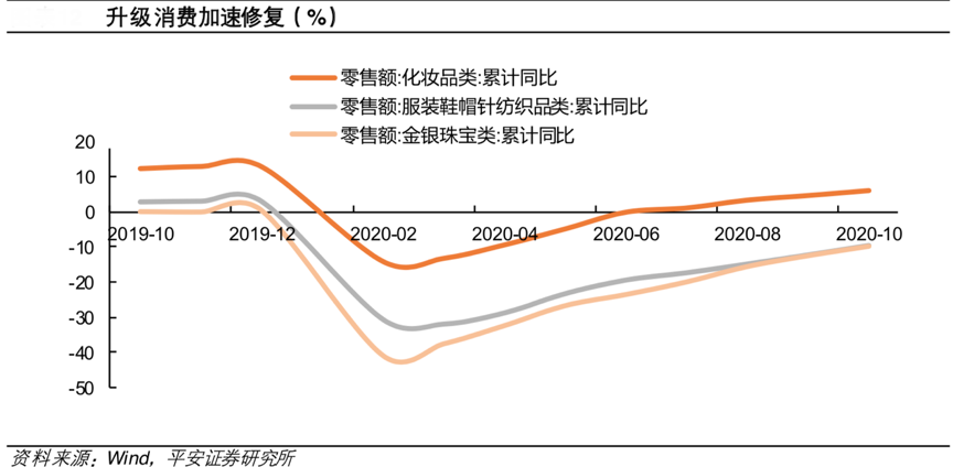 典型數據:根據wind、平安證券研究所等綜合資訊表明,升級消費主要包含化妝品、服裝針 織品、金銀珠寶等可選的裝扮類消費。隨著疫情影響的消退,增速也逐步回升。其中化妝品行業近年來景氣度維持高位,需求旺盛,品類零售增速率先回正。