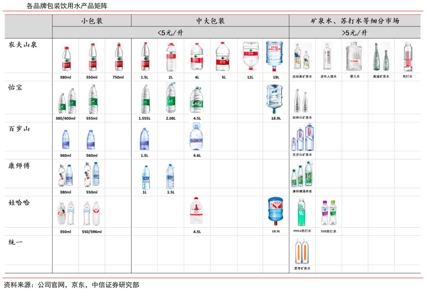 經典案例:根據公司官網、京東及中信證券研究部等綜合資訊表明,農夫山泉在包裝飲用水布局上兼具廣度和深度,一方面在包裝規模的設計上 SKU 最寬、最密,覆蓋各個消費場景;另一方面推出差異化產品(嬰兒水和鋰水)和高端化產品(天然礦泉水的運動蓋裝和玻璃瓶)。在飲料布局上,其布局成長較快的細分賽道并持續深耕選中的品類,享受行業發展紅利。