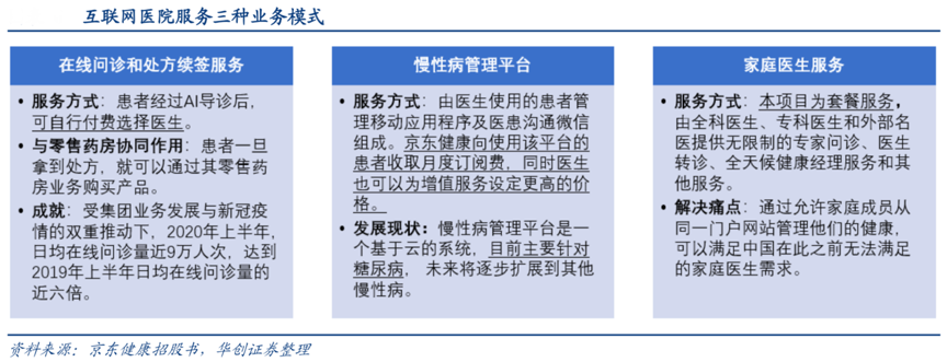 經典案例:根據京東健康招股書、華創證券等綜合資訊表明,互聯網醫院服務有三種業務模式,在線問診和處方續簽服務、慢性病管理平臺和家庭醫生服務,其服務形式多種多樣,京東健康以零售藥房業務、在線醫療健康服務業務強勢切入,極具成長潛力。