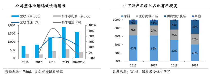 經典案例:根據wind、國泰君安證券研究等綜合資訊表明,華熙生物原料業務穩健增長,醫療終端產品以及功能性護膚品業務為其提供快速增長動力,公司整體業績穩健快速增長。2016-2019 年期間,其營收從 7.33 億增長到18.86 億,年復合增長率 37.0%。