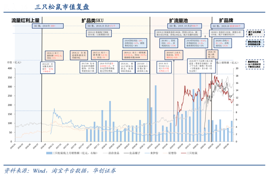 經典案例:根據wind、淘寶平臺數據和華創證券等綜合資訊表明,隨著競爭者入局、原有傳統品牌(例如恰恰)relocate 細分賽道,市場份額和單月線上銷售承壓,三只松鼠通過擴 SKU 與品類再拉高營收上限;銷售費用高+大促頻繁壓毛利后,加速拓寬流量池——線下+私域; 雖然流量觸達與積累相對緩慢,但用戶復購、成交轉化率提高,存量相對穩定。