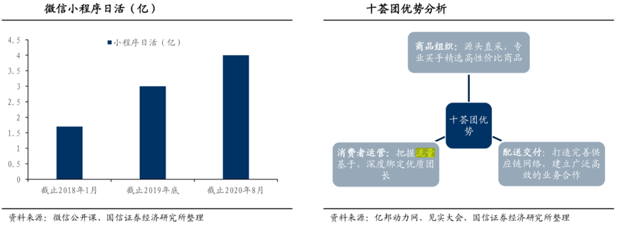 經(jīng)典案例:根據(jù)微信公開課、億邦動力網(wǎng)、見實大會、國信證券經(jīng)濟研究所等綜合資訊表明,十薈團微信小程序截止2020年8月,日活超過4億,這為社區(qū)團購企業(yè)提供了極好 的發(fā)展土壤。同時其自2019年便開始做團長直播帶貨,將產(chǎn)品篩選過程、制作工藝及廠房等信息通過直播的形式展現(xiàn)在消費者面前,從而提高消費者的信任度與粘性,帶動部分單品銷售額從直播前的萬元增長至十萬元。