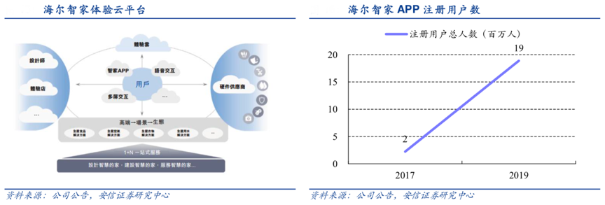 經典案例:根據公司公告、安信證券研究中心等綜合資訊表明,2019年底海爾上線了自主研發的海爾智家體驗云平臺,實現了用戶、經銷商及其門店的數字化系統的連接和整合,幫助海爾從銷售家電產品到銷售以互聯家電為核心的更豐富的產品和服務。截至 2020 年 6 月,海爾智家 APP 月活躍用戶達到 429 萬。
