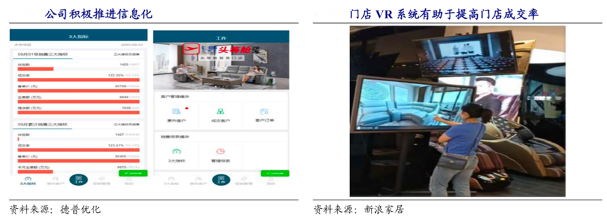經(jīng)典案例:根據(jù)德普優(yōu)化、新浪家居、開源證券研究所等綜合資訊表明,敏華控股公司近年積極在門店推行CRM 系統(tǒng)和 VR 系統(tǒng)。經(jīng)銷商通過 CRM 系統(tǒng)可以實(shí)時(shí)分析門店有效體驗(yàn)數(shù)、轉(zhuǎn)化率和客單價(jià)這三個(gè)指標(biāo),從而經(jīng)銷商可以有針對(duì)性地提升門店經(jīng)營(yíng)效率。VR 系統(tǒng)則方便消費(fèi)者根據(jù)自家戶型和裝修風(fēng)格,電子化立體展示沙發(fā)購(gòu)買效果,促進(jìn)消費(fèi)者購(gòu)買。