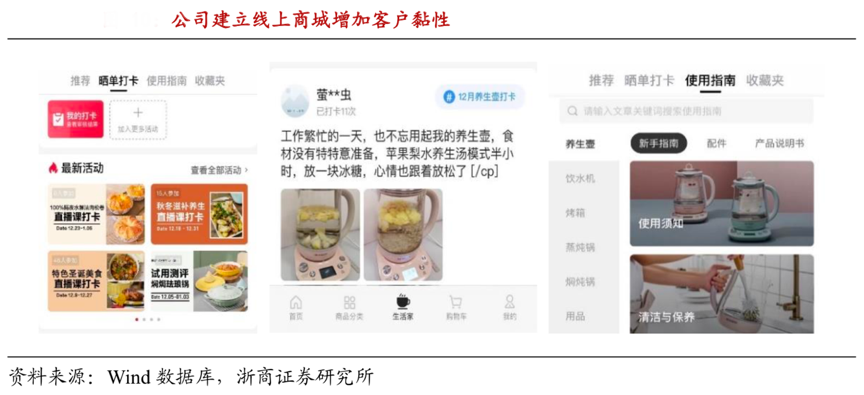 經典案例:根據wind數據庫、浙商證券研究所等綜合資訊表明,北鼎不止入駐天貓、京東等線上平臺,還構建了自己的線上官方商城。其官方商城中不僅僅售賣產品,還建立了與北鼎客戶間的交流平臺。用戶可在此平臺上溝通食譜,打卡互動,北鼎會定期更新一些視頻烹飪課來增加與客戶間的粘性,還聯合網絡當紅主播進行新時代直播帶貨。