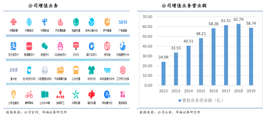 經(jīng)典案例:根據(jù)公司官網(wǎng)、大眾點(diǎn)評(píng)、華福證券研究所等綜合資訊表明,紅旗連鎖公司通過提供靈活豐富的增值服務(wù),主要涵蓋代收費(fèi)服務(wù)、快遞代收代派、充值、信用卡還款等項(xiàng)目。其多數(shù)增值服務(wù)執(zhí)行傭金制度,且不存在額外的成本,所以所獲傭金收入相當(dāng)于直接計(jì)入利潤。2012 年至 2019 年,公司增值業(yè)務(wù)營業(yè)額由 24.09 億元提高至 58.74 億元,CAGR 為 14%。