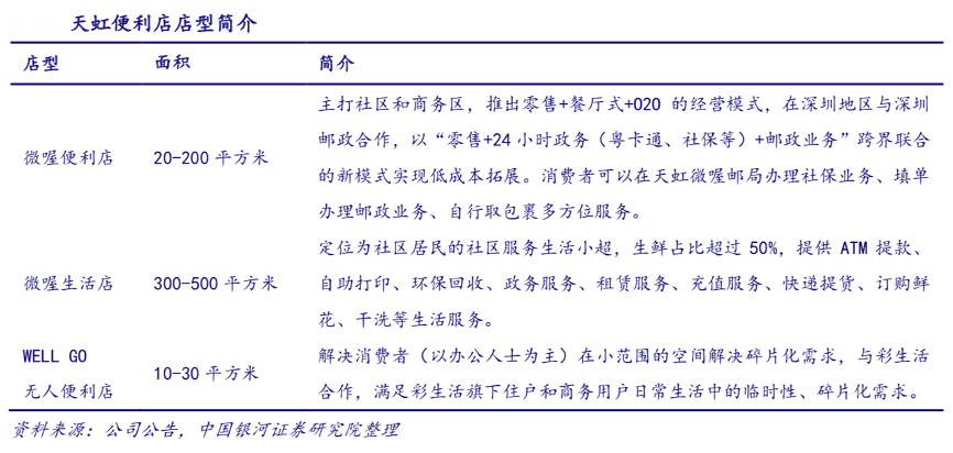 經典案例:根據公司公告、中國銀河證券研究院等綜合資訊表明,天虹便利店以多種店型組合,定位社區居民、商務群體等多種消費場景。微喔便利店和微喔生活點定位于社區生活,無人便利店定位在白領的都市生活。其現有的天虹微喔便利店已形成網格狀布局,在供應鏈方面資源共享,降低物流成本,提高配送效率。
