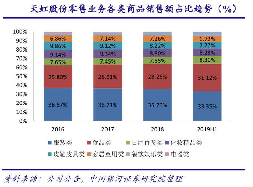 經典案例:根據公司公告、中國銀河證券研究院等綜合資訊表明,從商品品類的銷售額情況來看,截止 2019H1 百貨及購物中心中主要售賣的服裝類、化妝品精品類、皮鞋皮具類、家居童用類、電器商品合計占比天虹股份公司主營零售的比重為 56.54%,較 2016 年縮減 7.54 個百分點;而超市、便利店內銷售的食品類、日用品類商品合計占比 39.42%,側重體驗式的餐飲娛樂營收占比