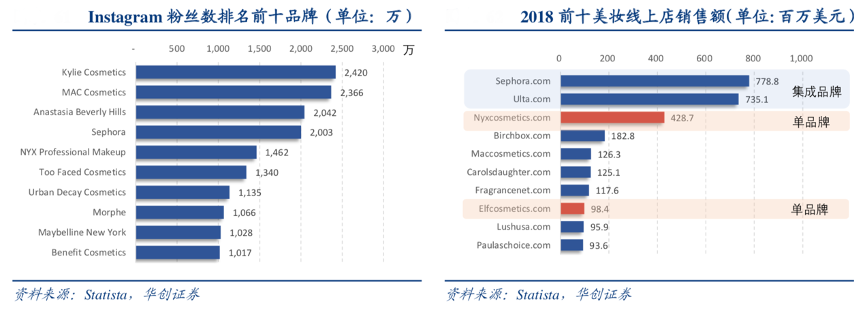經典案例:根據Statista統計、華創證券等綜合資訊表明,以美國彩妝品牌 E.L.F 為例,成立于 2004 年,成長于社交媒體時代。與大多數美國 新銳美妝牌子相似,不依賴于傳統的廣告和名人推廣,依賴社交媒體營銷(如TikTok)。 根據 Statista 統計, 除去絲芙蘭、Ulta 兩大品牌集成店,NYX 是 2018 年線上銷售冠軍, E.L.F 同在前十榜單。