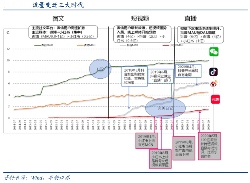 經典案例:根據wind、華創證券等綜合資訊表明,國產彩妝的新媒體營銷變遷經歷了三個階段:以小紅書為代表的 1.0 圖文時代,以抖音、快手為代表的 2.0 短視頻時代,以淘寶直播為代表的 3.0 直播時代。流量高地從圖文走向短視頻、直播,更適合彩妝品類進行廣告投放,小紅書等內容社區也形成了彩妝投放 KOL 廣告的重要渠道。圖文重在產品 介紹,短視頻打造產品使用場景和彩妝教程,直播有線上 BA 實時互動、進一步增強購 物體驗,營銷渠道的變遷使得彩妝的消費場景更加完整。