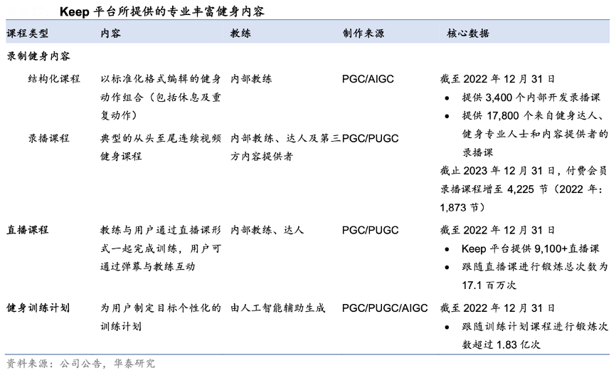 經典案例:根據公司公告、華泰研究等綜合資訊表明,Keep 平臺上的課程內容不僅是 Keep 核心內容資產與競爭力,也是驅動其用戶生態發展的底層,建立 Keep 相關運動生態的基礎。同時,Keep 利用基礎健身內容拓展用戶規模,創建 Keep 用戶社區,從社交維度提高用戶粘性。