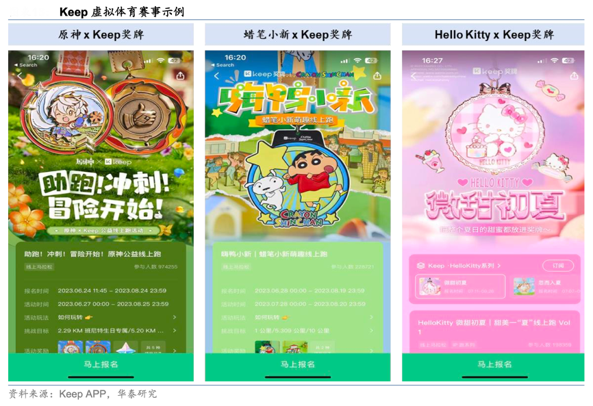 經典案例:根據Keep APP、華泰研究等綜合資訊表明,除標準化健身課程之外,Keep 積極與知名 IP 合作, 推出了虛擬體育賽事等線上付費內容。Keep 舉辦線上跑等體育賽事,用戶付費報名參加相 關活動,在完成所要求的體育鍛煉后即可獲得相應的賽事獎牌。