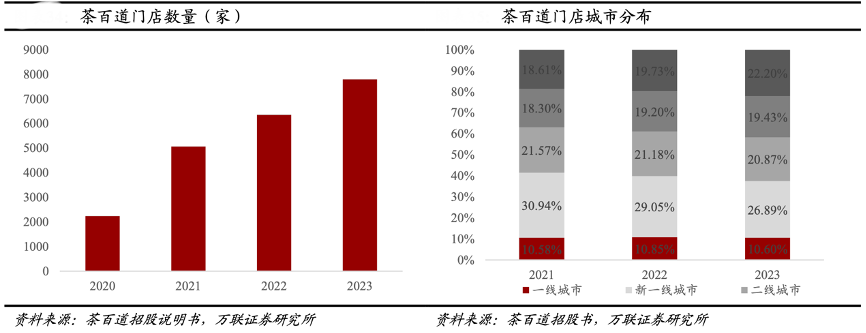 經(jīng)典案例:根據(jù)茶百道招股說明書、萬聯(lián)證券研究所等綜合資訊表明,茶百道門店在新一線城市、購物中心占比最高。截至2023年底,一線、新一線、二線、 三線、四線及以下城市門店數(shù)量分別占茶百道門店總數(shù)的10.6%、26.9%、20.9%、19.4% 及22.2%,其中新一線城市門店數(shù)量占比最高。