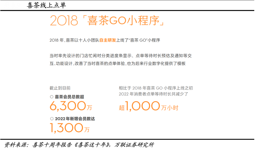 經典案例:根據喜茶十周年報告《喜茶這十年》、萬聯證券研究所等綜合資訊表明,喜茶門店數字化率也逐年升高,2018年,喜茶以十人小團隊自主 研發上線了“喜茶 GO”小程序當時率先設計的門店忙閑時分類進度條顯示、點單等待時長預估及通知等交互、功能設計,改善了當時喜茶的點單體驗,相比于2018年喜茶 GO 小程序上線之初,2022年消費者點單等待時長共減少了超1000萬小時。
