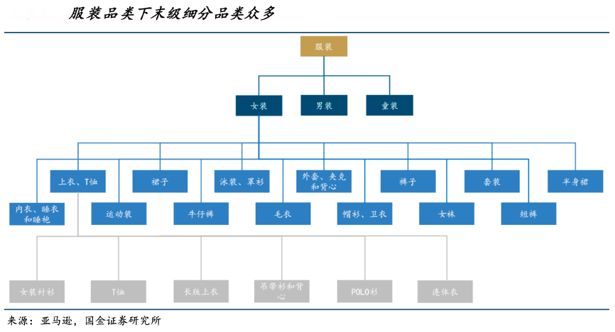 經典案例:根據亞馬遜、國金證券研究所等綜合資訊表明,亞馬遜細分品類眾多,單品類提份額邏輯持續有效。以女裝為例,次級細分品類有內衣、上衣、 T 恤、裙子等,而上衣、T恤這一次級細分品類又有女裝襯衫、T 恤、長版上衣等等末級品類,針對特定末級品類的產品布局,能夠迅速幫助服裝品牌打開市場,提高市場占有。